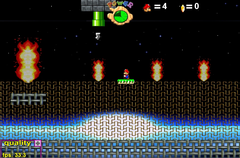 A quite short level where the fortress is only visible in basic approach and hangs loosely in the fire field background, but at least has a little bit of decoration and slopes. A typical beginner’s flaw, but the level itself is challenging to beat; it gives you something to do while you collect the three silver stars. All in all, a fairly mediocre level.