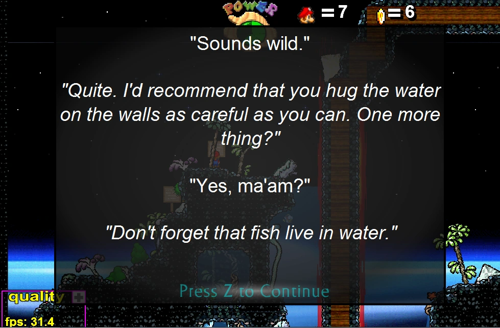 Another segment of Volkove’s very innovative and exciting puzzle levels. It mostly consists of rooms being flipped upside down, being filled with water, or involving power caps. Each change of a room is announced with its very special arrow. There may be a few tricky spots such as letting a metal cap time out perfectly to stomp underwater blocks but not sink down, but the overall concept is amazing, especially the room layout in the second puzzle “Space Walk”, where you’re floating by the well-known green platform glitch.