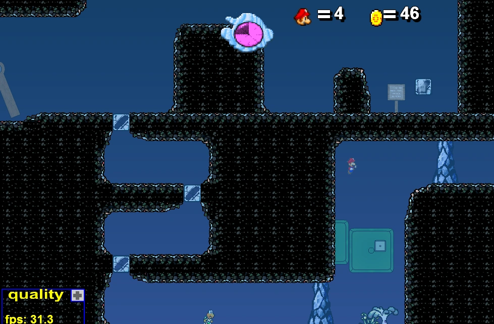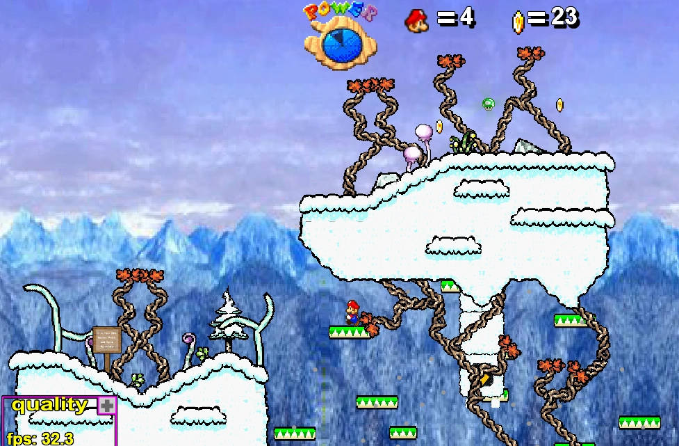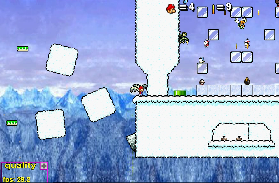 A combination of a rather classic snow platformer with an unoriginal plot, a sort of adventurer being stranded in these hills and separated from his mates, the Shy Guys, and therefore struggling for survival. It incorporates a plot of hallucination where the character pretends to be in water (and in the game, he is in water, but only in the game!). The journey until the water is pretty rich in variety, and unfortunately the gameplay flattens inside the water, but it gives a good play overall.