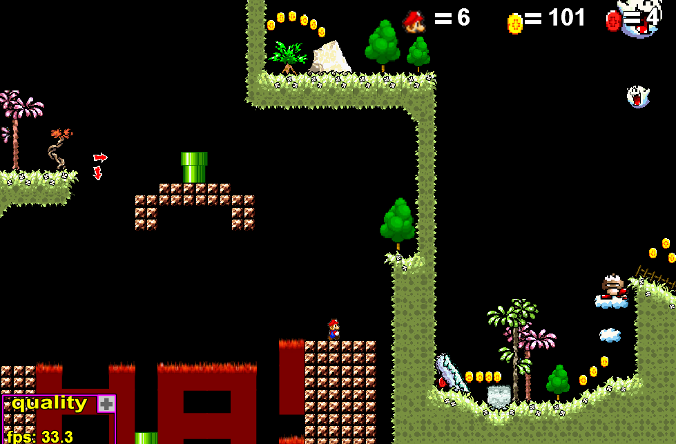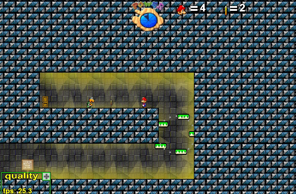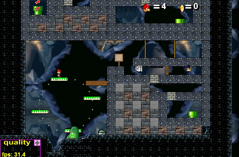 This is one of many levels of Brawler showing incredible potential and awesome gameplay possibilities, but missing the final ambition to conclude it to the end. It starts with a very clever concept of non-linearity (riding a platform down and up to hit a switch), and its graphics are lovely mostly but sometimes also a bit flattened, but overall it’s still very well-made. (Note: at the point where it looks like you’re stuck due to switch bricks, you need to find a hidden pipe)