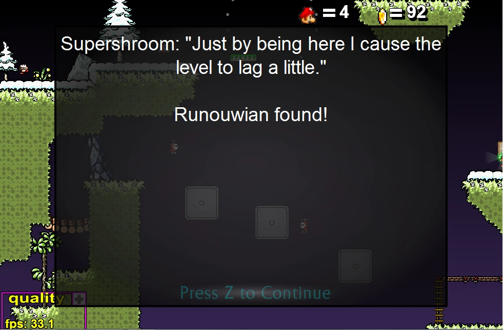 A very relaxed Pure Platformer level, like you won’t find many of them. Multi-themed in the way of Niveau Victorieux Galaxy, this level takes you smoothly up to higher places, and once again, Nan prooves his strong skill of finding good musics. The level is mostly rather easy, but it has a special attraction, the “Runouwian founds” at outlying or hidden places, where some notable users give you a nice greeting.