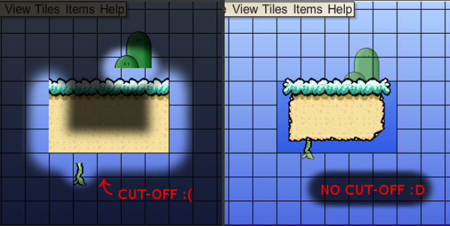- Cutoff is generally refers to tile misuse, where you are using tiles that do not have detailed edges, when it is appropriate. There are decorative edges for every kind of landmass available. Another kind of cutoff is caused by camera interactions with the calculated borders of the level called border blindness.